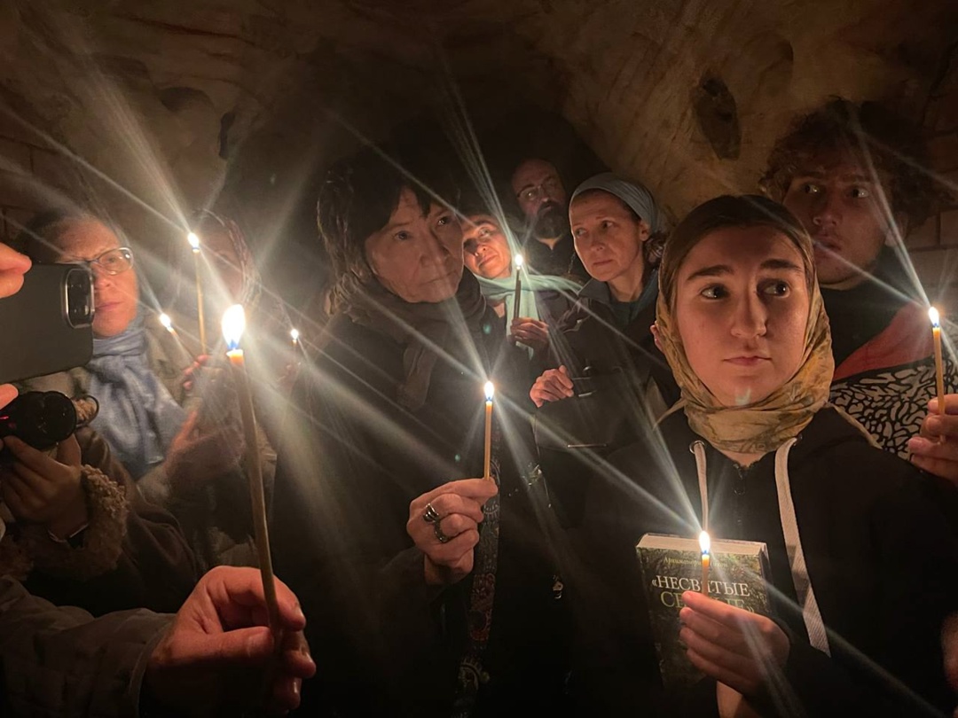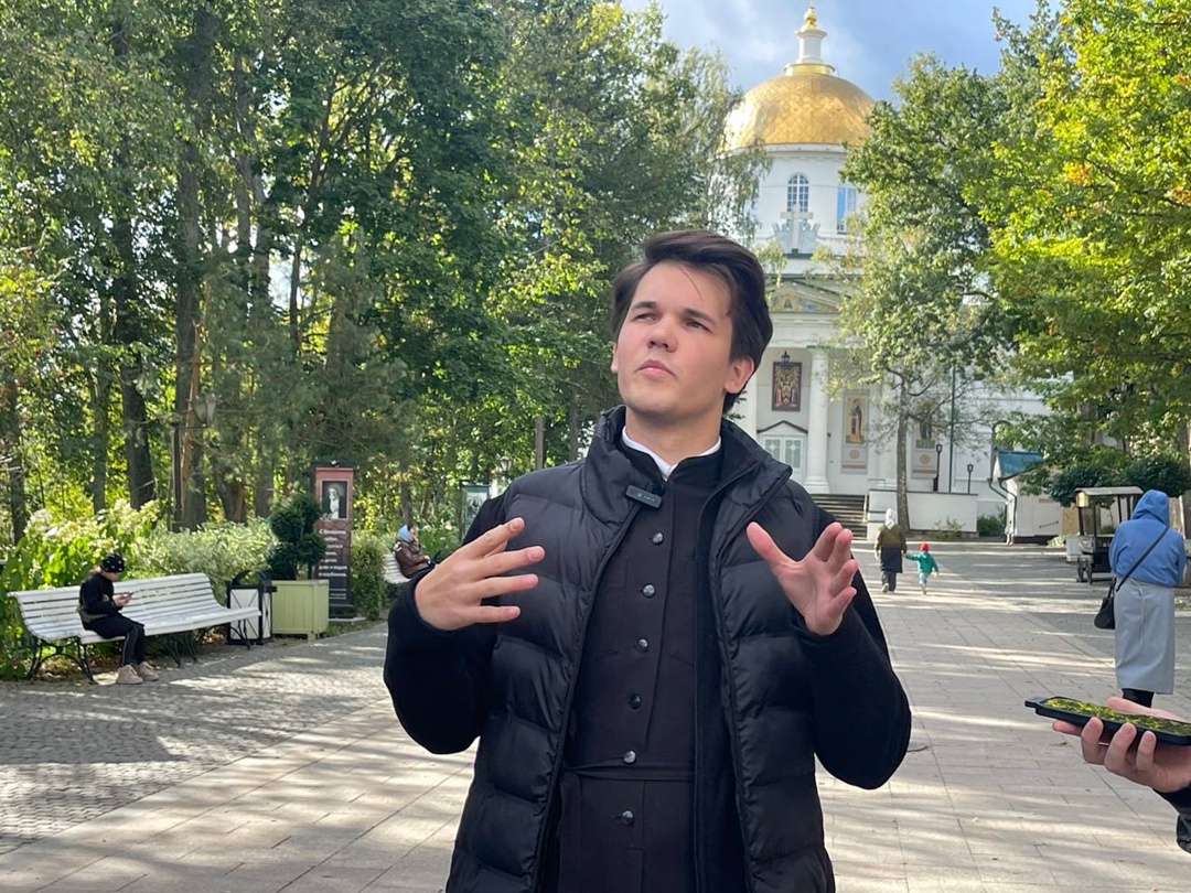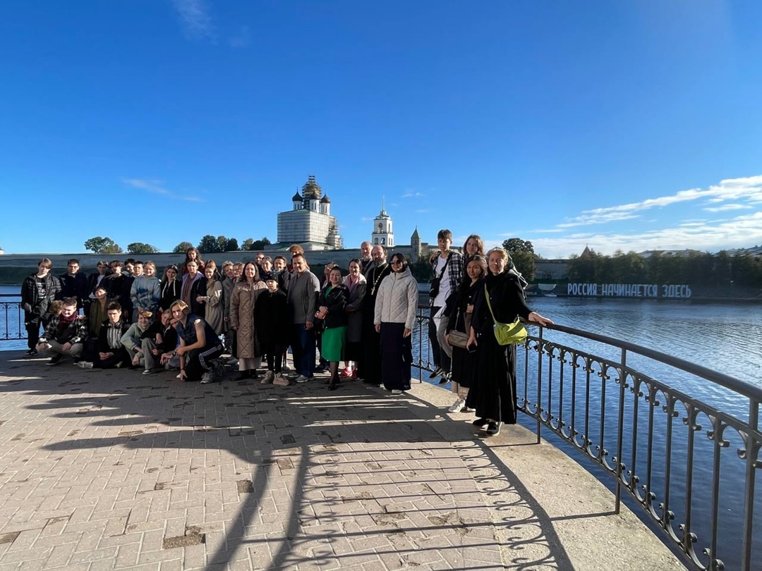 Из Пскова путешественники отправились в древний Псково-Печерский монастырь. Увлекательную экскурсию провел для них Алексей Агеев, студент 3-го курса Псково-Печерской семинарии. Вместе с экскурсоводом ребята посетили храмы, пещеры обители, остановились у памятника «Наши псково-печерские подвижники» (скульптор Виталий Шанов, 2023), включающего в себя 9 фигур псково-печерских старцев: архимандритов Иоанна (Крестьянкина), Алипия (Воронова), Серафима (Розенберга), Нафанаила (Поспелова), Феофана (Молявко), Адриана (Кирсанова), Михаила, Симеона, Саввы.